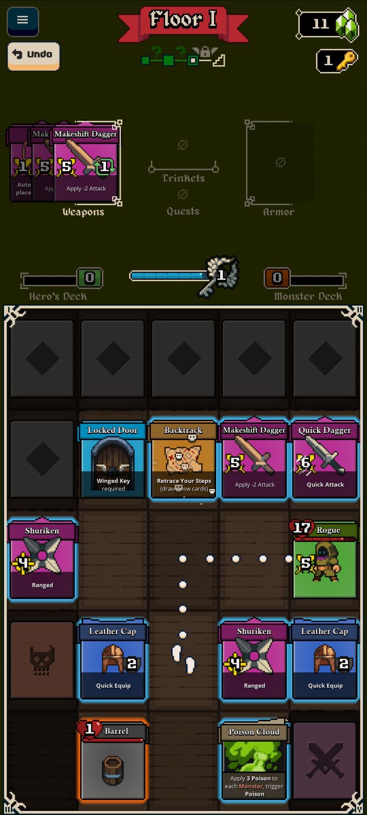 Це картковий roguelite, у якому кожна локація складається з випадкових карт моєї та ворожої колод. У моїй колоді можуть бути зброя, броня, магічні сувої та посилення. У ворожій – різні типи ворогів.